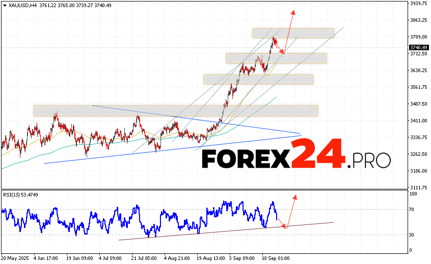 GOLD Forecast and XAU/USD Analysis for September 25, 2025 suggests an attempt to develop a bearish price correction and a test of the support area near 3725. Subsequently, a continued rise in base metal prices with a target above 3945. A decline in the market price and a breakout of 3645 would cancel the upward price scenario for gold. This would indicate a continued decline in gold prices with a potential target below 3565.