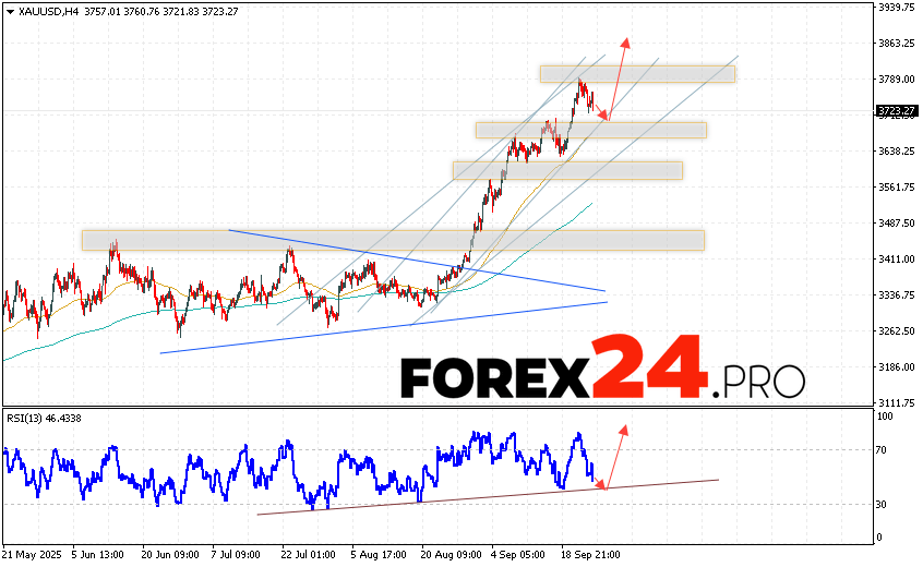 GOLD Forecast and XAU/USD Analysis for September 26, 2025 suggests an attempt to develop a bearish price correction and a test of the support area near 3705. Subsequently, a continued rise in base metal prices with a target above 3865. A decline in the asset’s market price and a breakout of 3665 would cancel the upward price scenario for gold. This would indicate a continued decline in gold prices with a potential target below 3575.