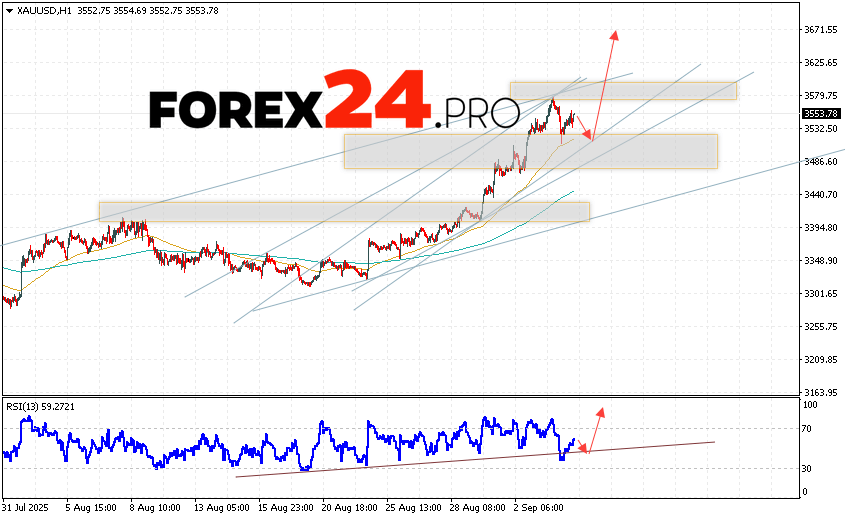 GOLD Forecast and XAU/USD Analysis for September 5, 2025 suggests an attempt to develop a bearish price correction and test the support area near the 3525 level. Further, the continuation of the rise in non-ferrous metal quotes with a target above the 3675 level. The cancellation of the growth scenario for Gold prices will be a fall in the value of the asset on the markets and a breakout of the 3475 level. This will indicate a continuation of the decline in Gold prices with a potential target below the 3425 mark.