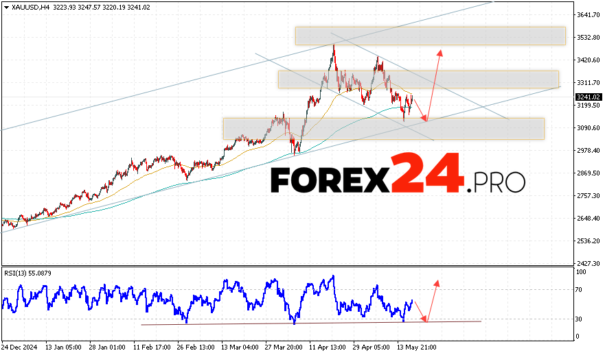 GOLD Forecast and XAUUSD Analysis for May 20, 2025 anticipates an attempt to develop a bearish price correction and testing the support area near the level of 3165. Subsequently, continuation of the increase in metal prices towards higher levels above 3405. Confirmation of the price rise scenario for Gold will be a drop in the asset’s value on markets and breaking through the level of 3085. This would indicate continued price depreciation for Gold with a potential target below the marker at 2845.