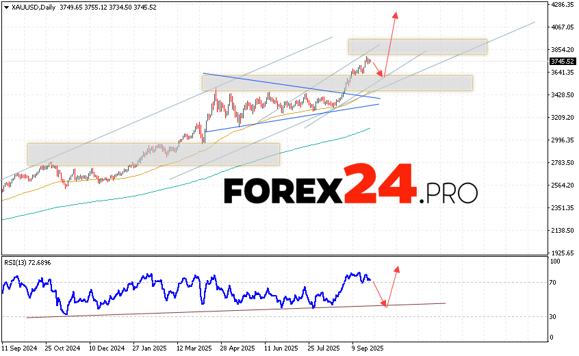 GOLD Forecast XAU/USD for September 29 — October 3, 2025 suggests an attempt to develop a bearish correction and test the support level near 3635. Then, gold prices will continue to rise with a target above 4075. A test of the trendline on the relative strength indicator (RSI) will support the upward trend. A decline and a breakout of 3445 would cancel out Gold’s growth scenario. This would indicate a continued decline below 3085.