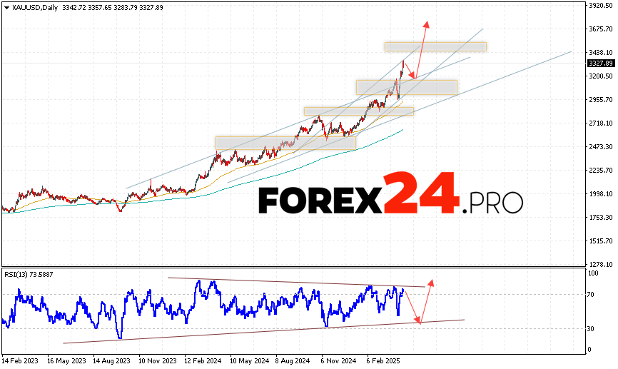 GOLD Weekly Forecast April 21 — 25, 2025 suggests an attempt to develop a bearish correction and test the support level near the 3205 area. Then, the continuation of the growth of Gold prices with a target above the 3675 level. A test of the trend line on the relative strength indicator will be in favor of the rise in quotes. The cancellation of the Gold growth option will be a fall and a breakout of the 3165 level. This will indicate a continuation of the decline in quotes to the area below the 2785 level.