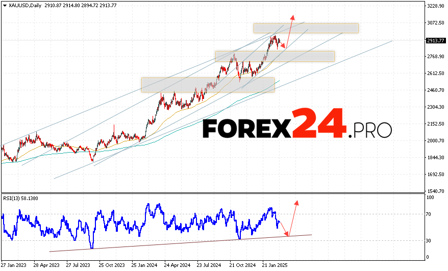 GOLD Weekly Forecast March 10 — 14, 2025 suggests an attempt to develop a bearish correction and test the support level near the 2865 area. Then, the continuation of the growth of Gold prices with a target above the 3085 level. The test of the trend line on the relative strength indicator will be in favor of increasing quotes. The option of increasing Gold will be cancelled by a fall and a breakout of the 2745 level. This will indicate a continuation of the decline in quotes to the area below the 2675 level.