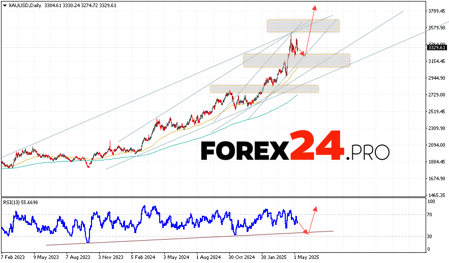 GOLD Weekly Forecast May 12 — 16, 2025 suggests an attempt to develop a bearish correction and test the support level near the 3195 area. Then, the continuation of the growth in Gold prices with a target above the 3785 level. A test of the trend line on the relative strength indicator will be in favor of the rise in quotes. The cancellation of the option for the growth of Gold will be a fall and a breakout of the 3115 level. This will indicate a continuation of the decline in quotes to the area below the 2845 level.