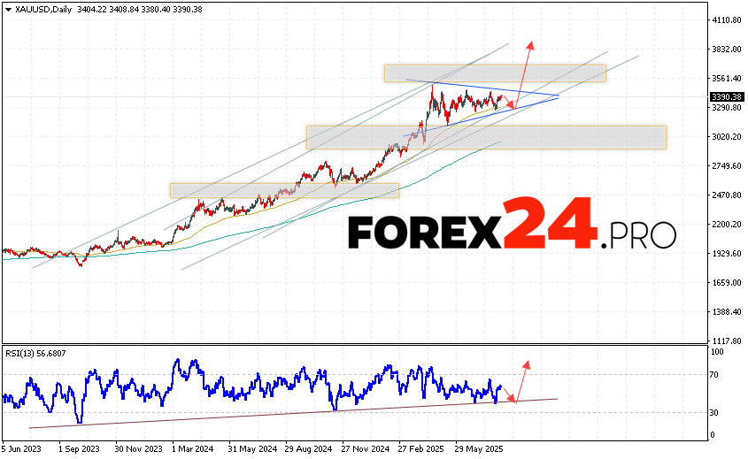 GOLD Weekly Forecast XAU/USD August 11 — 15, 2025 suggests an attempt to develop a bearish correction and test the support level near the 3275 area. Then, gold prices will continue to rise with a target above the 3825 level. The test of the trend line on the relative strength indicator will support the rise in quotes. A fall and breakout of the 3105 level will cancel the growth scenario for gold. This will indicate a continuation of the decline in quotes to the area below the 2665 level.