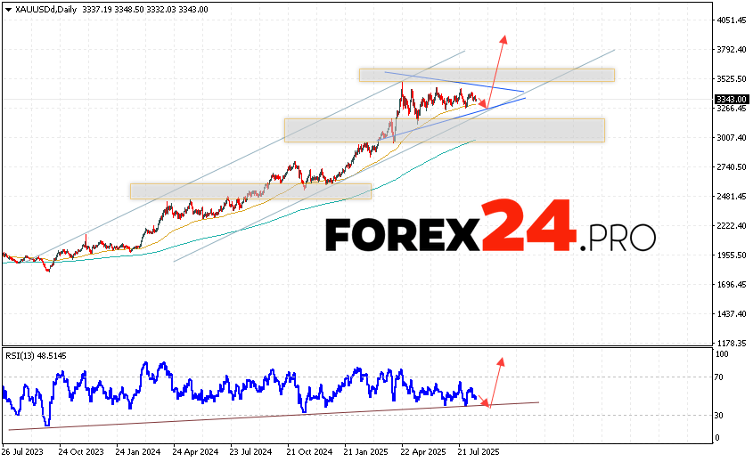 GOLD Weekly Forecast XAU/USD August 18 — 22, 2025 suggests an attempt to develop a bearish correction and test the support level near the 3295 area. Then, the price of gold will continue to rise with a target above the 3805 level. The test of the trend line on the relative strength indicator will support the rise in quotes. A fall and breakout of the 3225 level will cancel the growth scenario for gold. This will indicate a continuation of the decline in quotes to the area below the 2865 level.