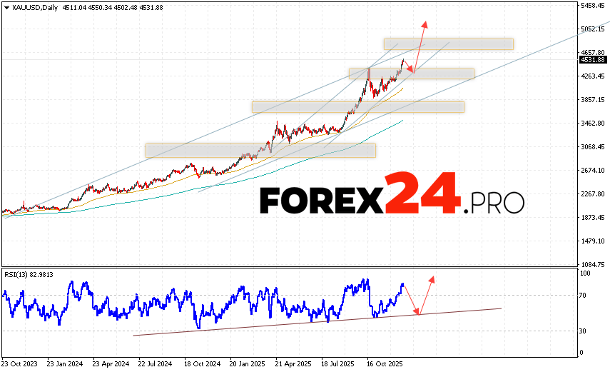 GOLD Weekly Forecast XAU/USD December 29, 2025 — January 2, 2026 suggests an attempt to develop a bearish correction and test the support level near 4285. Then, gold prices will continue to rise with a target above 5055. A test of the trendline on the relative strength indicator (RSI) would support an upward trend. A decline and a breakout of 4145 would cancel out Gold’s growth scenario. This would indicate a continued decline below 3745.
