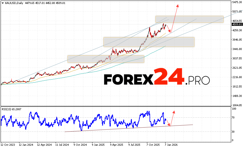 GOLD Weekly Forecast XAU/USD January 12 – 16, 2026 suggests an attempt to develop a bearish correction and test the support level near 4235. Then, gold prices will continue to rise with a target above 5165. A test of the trendline on the relative strength indicator (RSI) will support the upward trend. A decline and a breakout of 3945 would cancel out Gold’s growth scenario. This would indicate a continued decline below 3785.