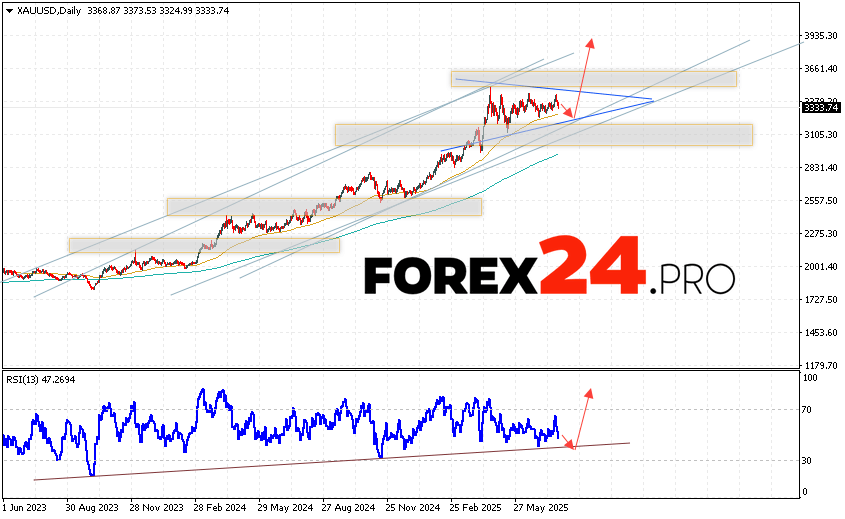 GOLD Weekly Forecast XAU/USD July 28 — August 1, 2025 suggests an attempt to develop a bearish correction and test the support level near the 3305 area. Then, the price of gold will continue to rise with a target above the 3935 level. The test of the trend line on the relative strength indicator will support the rise in quotes. A fall and breakout of the 3105 level will cancel the growth scenario for gold. This will indicate a continuation of the decline in quotes to the area below the 2925 level.