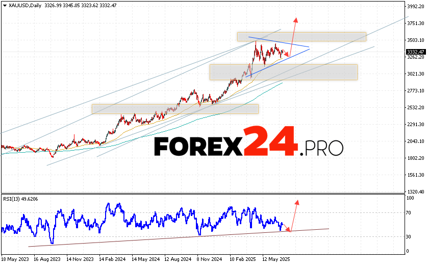 GOLD Weekly Forecast XAU/USD July 7 — 11, 2025 suggests an attempt to develop a bearish correction and test the support level near the 3260 area. Then, the continuation of Gold prices growth with a target above the level of 3745. A test of the trend line on the relative strength indicator will be in favor of the quotes’ rise. A fall and breakdown of the level 3145 will cancel the variant of Gold growth. This will indicate the continuation of quotes decline to the area below the level of 2965.