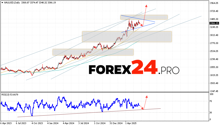 GOLD Weekly Forecast XAU/USD June 23 — 27, 2025 suggests an attempt to develop a bearish price correction and test the support area near the 3305 level. Further, the non-ferrous metal quotes will continue to grow with a target above the 3745 level. A decline in the asset’s value on the markets and a breakout of the 3215 level will negate the possibility of gold price growth. This will indicate a continuation of the decline in the price of GOLD with a potential target below the 3165.