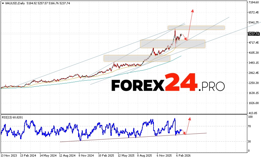 GOLD Weekly Forecast XAU/USD March 2 – 6, 2026 suggests a bearish correction toward 4985, followed by continued growth with a target above 6575. A breakout below 4345 would cancel the bullish scenario and indicate a decline toward levels below 3765.