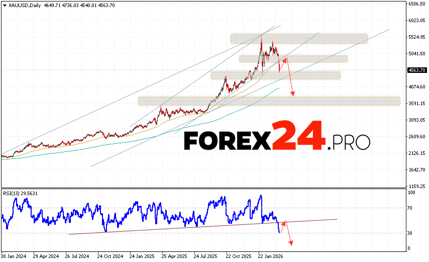 GOLD Weekly Forecast XAU/USD March 23 – 27, 2026 suggests an attempt to develop a bullish correction and test the resistance level near 4795. Then, a continued decline in gold prices with a target below 3705 will be expected. A test of the trendline on the relative strength indicator (RSI) will support a downward trend. A strong rally and a breakout of 5105 would cancel out the gold decline scenario. This would indicate a continued rise above 5505.