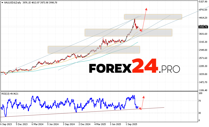 GOLD Weekly Forecast XAU/USD November 10 – 14, 2025 suggests an attempt to develop a bearish correction and test the support level near 3865. Then, gold prices will continue to rise with a target above 4795. A test of the trendline on the relative strength indicator (RSI) will support an upward trend. A decline and a breakout of 3535 would cancel out the gold rally. This would indicate a continued decline below 2815.