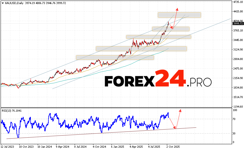 GOLD Weekly Forecast XAU/USD October 13 – 17, 2025 suggests an attempt to develop a bearish correction and test the support level near 3775. Then, gold prices will continue to rise with a target above 4465. A test of the trendline on the relative strength indicator (RSI) will support an upward trend. A decline and a breakout of 3535 would cancel out the gold rally. This would indicate a continued decline below 3075.