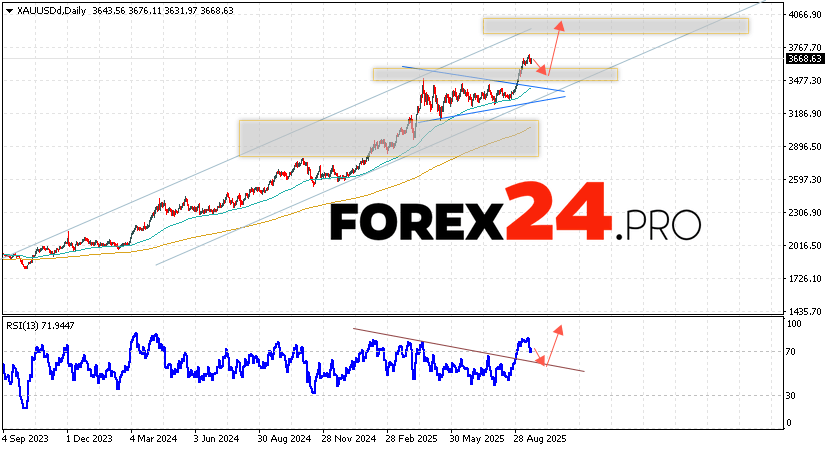An additional signal favoring growth in gold quotes and prices this trading week (September 22-26, 2025) will be a rebound from the bullish trendline on the relative strength indicator (RSI). A second signal will be a rebound from the upper boundary of the Triangle pattern. The XAU/USD price rally would be cancelled if the pair were to fall and break above 3205. This would indicate a break of the lower boundary of the bullish channel and a continued decline in gold prices with a target below 2745. A break of the resistance area and a close above 3745 would confirm the asset’s price rise.