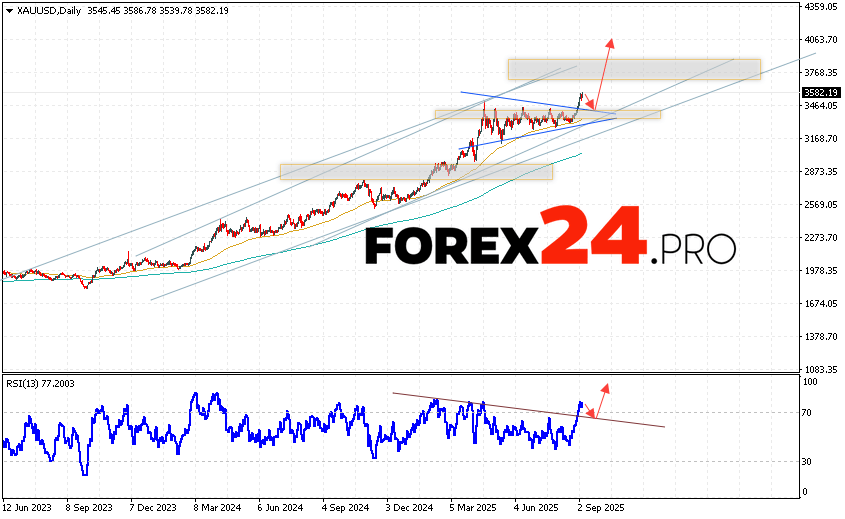 GOLD Weekly Forecast XAU/USD September 8 – 12, 2025 suggests an attempt to develop a bearish correction and test the support level near the 3465 area. Then, a continuation of the growth of GOLD prices with a target above 4065. A test of the trend line on the relative strength indicator will be in favor of increasing quotes. The cancellation of the growth option for GOLD will be a fall and a breakout of the 3245 level. This will indicate a continuation of the decline in quotes to the area below the 2785 level.