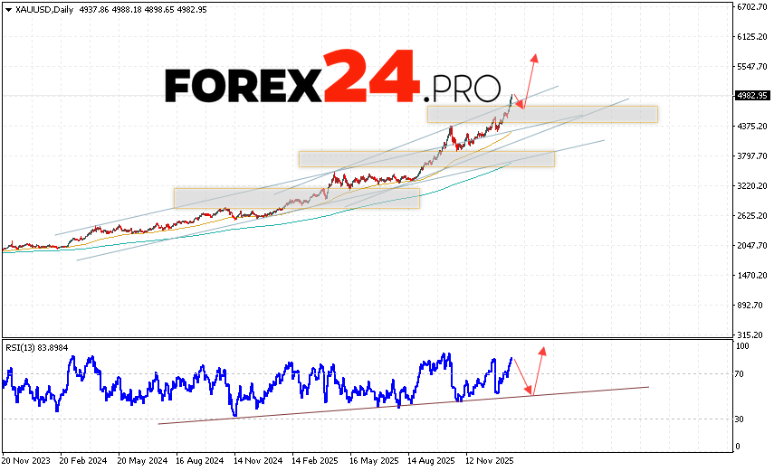 GOLD Weekly Forecast XAUUSD January 26 – 30, 2026 suggests an attempt to develop a bearish correction and test the support level near 4675. Then, gold prices will continue to rise with a target above 5545. A test of the trendline on the relative strength indicator (RSI) will support an upward trend. A decline and a breakout of 4425 would cancel out the gold rally. This would indicate a continued decline below 3815.