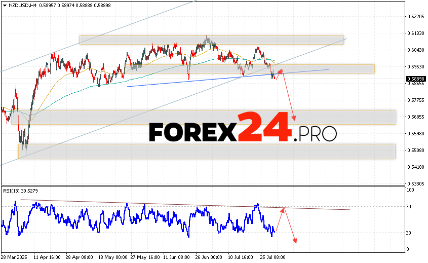 NZD/USD Forecast and Analysis for August 1, 2025 suggests an attempt to test the resistance area near the 0.5925 level. From there, we can expect the quotes to continue falling to an area below the 0.5675 level. An additional signal in favor of a decline will be a rebound from the resistance line on the relative strength indicator. A strong price increase and a breakout of the 0.6055 level will cancel the decline of the NZD/USD pair. In this case, we can expect the pair to continue rising with a potential target above the 0.6185 level.
