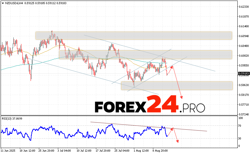 NZD/USD Forecast and Analysis for August 15, 2025 suggests an attempt to test the resistance area near the 0.5955 level. From there, we can expect the quotes to continue falling to an area below the 0.5815 level. An additional signal in favor of a decline will be a rebound from the resistance line on the relative strength indicator. A strong price increase and a breakout of the 0.6035 level will cancel the decline of the NZD/USD pair. In this case, we can expect the pair to continue rising with a potential target above the 0.6215 level.