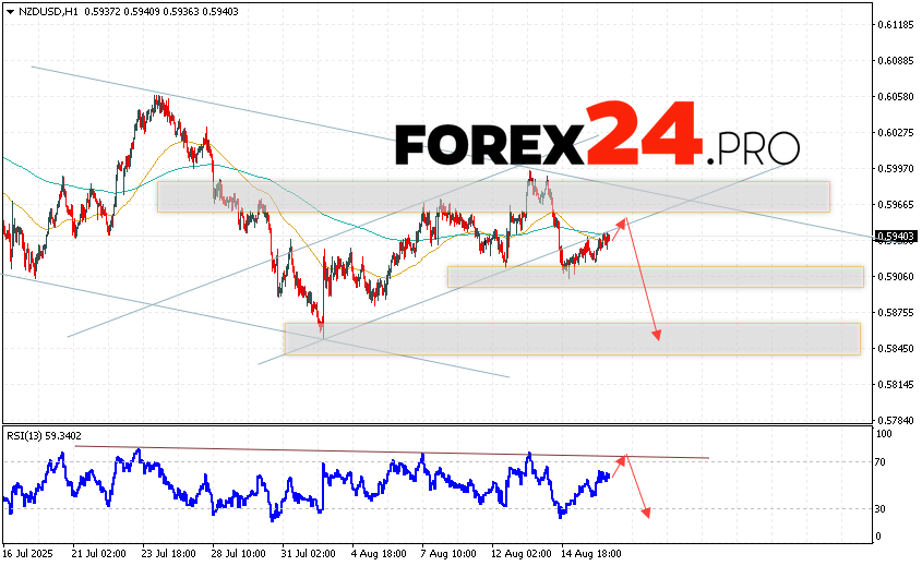 NZDUSD Forecast and Analysis for August 19, 2025 suggests an attempt to test the resistance area near the level of 0.5965. From where we should expect a continuation of the fall in quotes to the area below the level of 0.5845. An additional signal in favor of the decline will be a rebound from the resistance line on the relative strength indicator. The cancellation of the fall option for the NZD/USD pair will be a strong price increase and a breakout of the level of 0.6025. In this case, we should expect a continuation of the rise of the pair with a potential target above the level of 0.6185.