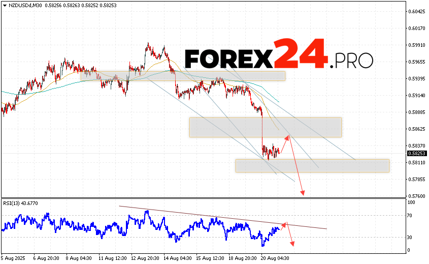 NZD/USD Forecast and Analysis for August 21, 2025 suggests an attempt to test the resistance area near the level of 0.5845. From where we should expect a continuation of the fall in quotes to the area below the level of 0.5765. An additional signal in favor of the decline will be a rebound from the resistance line on the relative strength indicator. The cancellation of the fall option for the NZD/USD pair will be a strong price increase and a breakout of the level of 0.5975. In this case, we should expect a continuation of the rise of the pair with a potential target above the level of 0.6175.