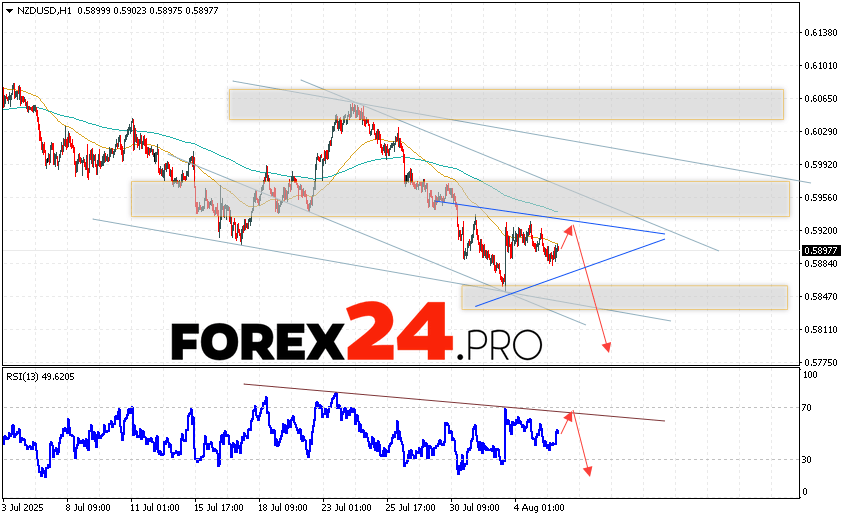 NZD/USD Forecast and Analysis for August 6, 2025 suggests an attempt to test the resistance area near the 0.5925 level. From there, we can expect a continued decline in quotes to the area below the 0.5765 level. An additional signal in favor of a decline will be a rebound from the resistance line on the relative strength indicator. A strong price increase and a breakout of the 0.5965 level will cancel the decline of the NZD/USD pair. In this case, we can expect the pair to continue rising with a potential target above the 0.6215 level.