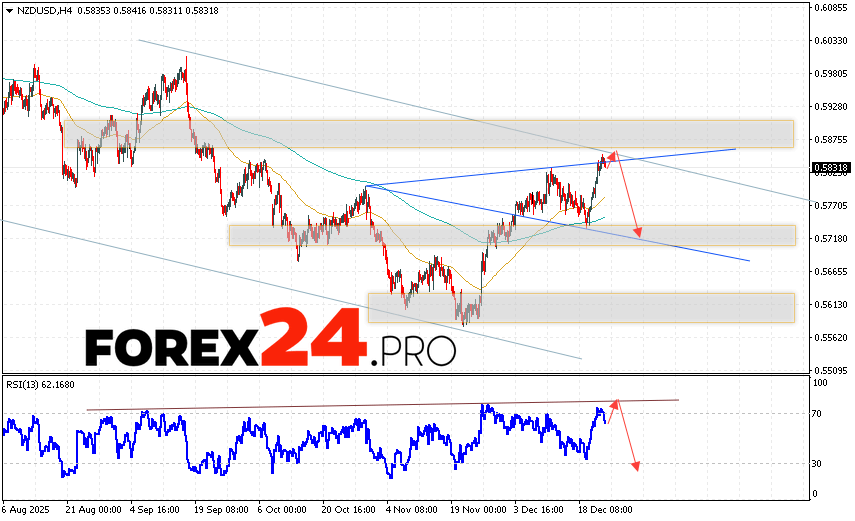 NZD/USD Forecast and Analysis for December 26, 2025 suggests an attempt to test the resistance area near 0.5865. From there, we should expect a continued decline below 0.5725. A rebound from the resistance line on the relative strength indicator (RSI) would be an additional signal of decline. A strong price increase and a breakout of 0.5885 would cancel the NZD/USD pair’s downward trend. In this case, we should expect continued growth with a potential target above 0.5995.