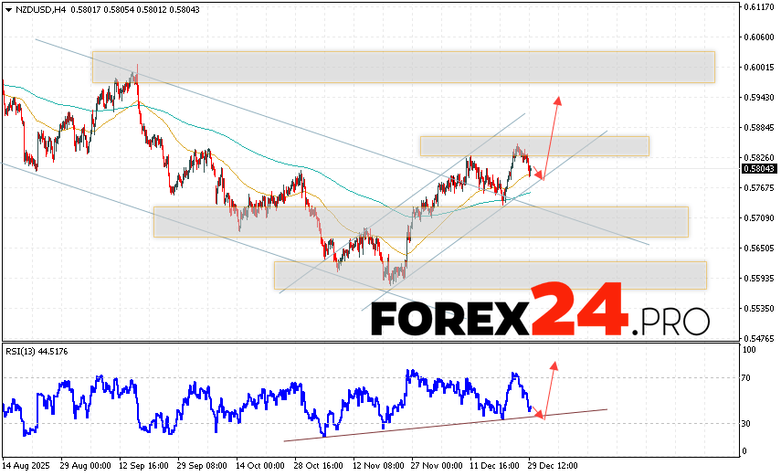 NZD/USD Forecast and Analysis for December 30, 2025 suggests an attempt to test the support area near 0.5795. From there, we should expect continued price growth above 0.5945. A rebound from the support line on the relative strength indicator (RSI) would be an additional signal in favor of an uptrend. A price decline and a breakout of 0.5705 would cancel out the NZD/USD pair’s upward trend. In this case, we should expect continued decline, with a potential target below 0.5565.