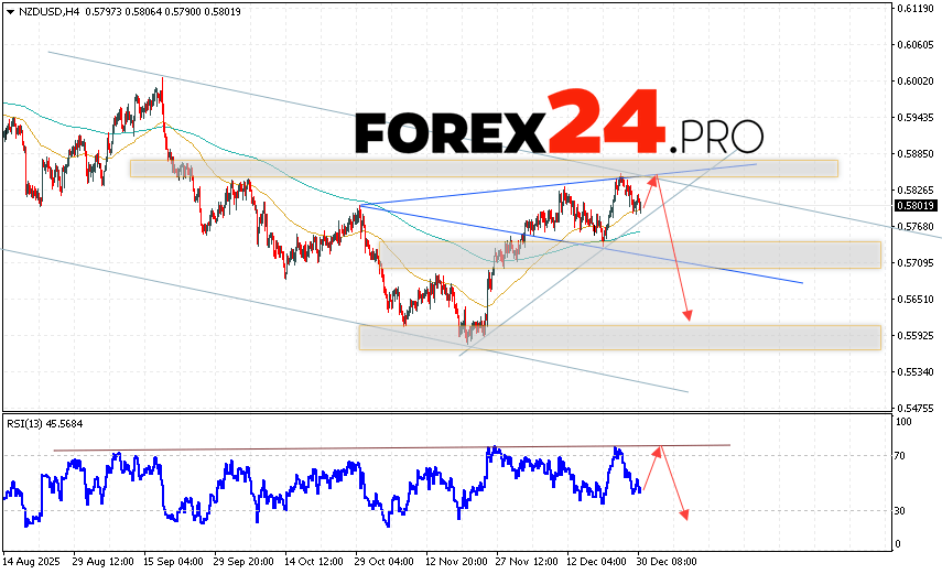 NZD/USD Forecast and Analysis for December 31, 2025 suggests an attempt to test the resistance area near 0.5825. From there, we should expect a continued decline in quotes below 0.5615. A rebound from the resistance line on the relative strength indicator (RSI) would be an additional signal for a decline. A strong price increase and a breakout of 0.5905 would cancel the NZD/USD’s downward trend. In this case, we should expect continued growth with a potential target above 0.6165.