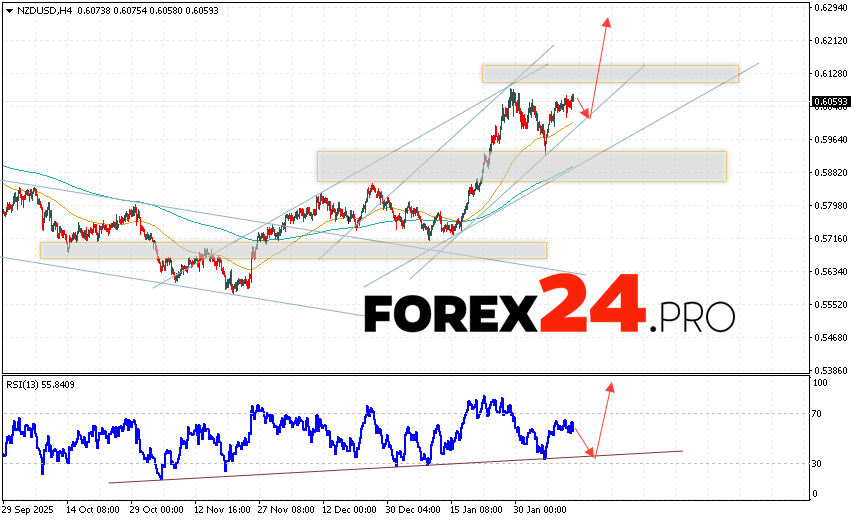 NZD/USD Forecast and Analysis for February 13, 2026 suggests an attempt to test the support area near 0.6045. From there, we should expect continued price growth above 0.6245. A rebound from the support line on the relative strength indicator (RSI) would be an additional signal in favor of an uptrend. A price decline and a breakout of 0.5955 would cancel out the NZD/USD pair’s upward trend. In this case, we should expect continued declines with a potential target below 0.5825.