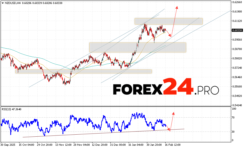 NZD/USD Forecast and Analysis for February 17, 2026 suggests an attempt to test the support area near 0.6005. From there, we should expect continued price growth above 0.6235. A rebound from the support line on the relative strength indicator (RSI) would be an additional signal in favor of an uptrend. A price decline and a breakout of 0.5925 would cancel out the NZD/USD pair’s upward trend. In this case, we should expect continued decline, with a potential target below 0.5775.