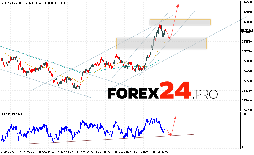 NZD/USD Forecast and Analysis for February 4, 2026 suggests an attempt to test the support area near 0.5985. From there, we should expect continued price growth above 0.6245. A rebound from the support line on the relative strength indicator (RSI) would be an additional signal in favor of an uptrend. A price decline and a breakout of 0.5925 would cancel out the NZD/USD’s upward trend. In this case, we should expect continued decline, with a potential target below 0.5775.