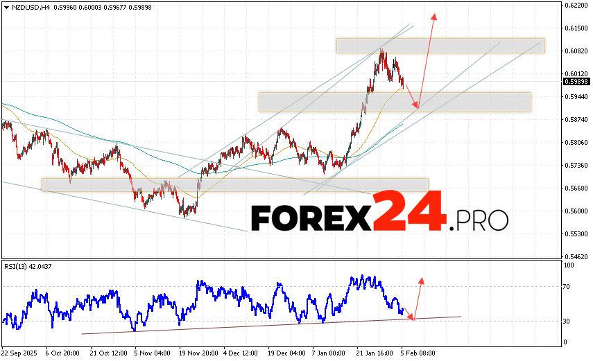 NZD/USD Forecast and Analysis for February 6, 2026 suggests an attempt to test the support area near 0.5905. From there, we should expect continued price growth above 0.6175. A rebound from the support line on the relative strength indicator (RSI) would be an additional signal in favor of an uptrend. A price decline and a breakout of 0.5845 would cancel out the NZD/USD uptrend. In this case, we should expect continued decline with a potential target below 0.5725.