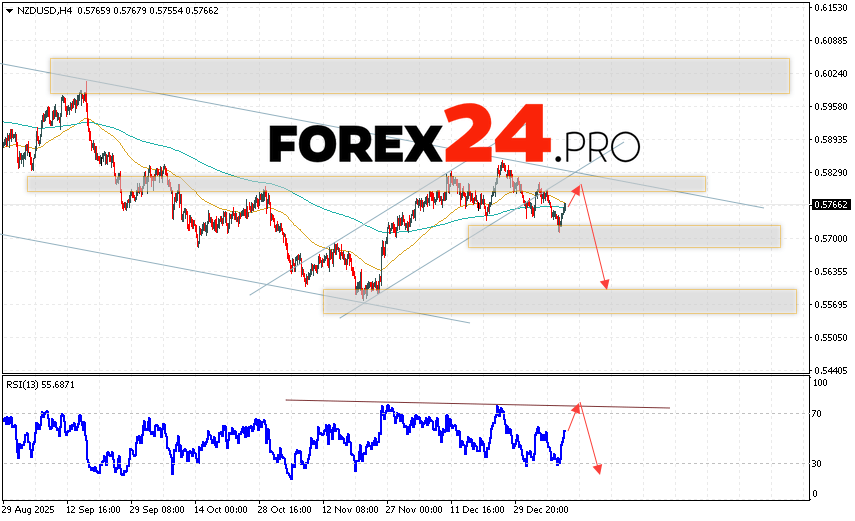 NZD/USD Forecast and Analysis for January 13, 2026 suggests an attempt to test the resistance area near 0.5785. From there, we should expect a continued decline below 0.5585. A rebound from the resistance line on the relative strength indicator (RSI) would be an additional signal of decline. A strong price increase and a breakout of 0.5915 would cancel out the NZD/USD downside scenario. In this case, we should expect continued growth with a potential target above 0.6155.