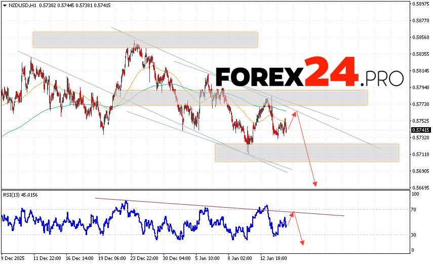 NZD/USD Forecast and Analysis for January 15, 2026 suggests an attempt to test the resistance area near 0.5760. From there, we should expect a continued decline below 0.5665. A rebound from the resistance line on the relative strength indicator (RSI) would be an additional signal of decline. A strong price increase and a breakout of 0.5835 would cancel out the NZD/USD pair’s downward trend. In this case, we should expect continued growth with a potential target above 0.6125.