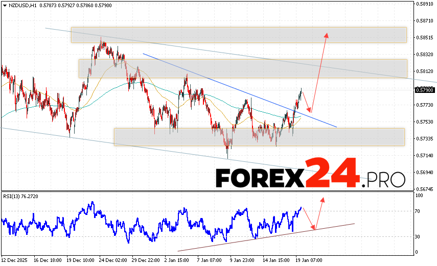 NZD/USD Forecast and Analysis for January 20, 2026 suggests an attempt to test the support area near 0.5755. From there, we should expect continued price growth above 0.5865. A rebound from the support line on the relative strength indicator (RSI) would be an additional signal in favor of an uptrend. A price decline and a breakout of 0.5705 would cancel out the NZD/USD uptrend. In this case, we should expect continued decline with a potential target below 0.5535.