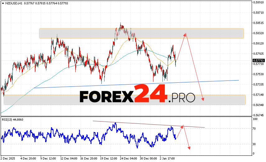 NZD/USD Forecast and Analysis for January 7, 2026 suggests an attempt to test the resistance area near 0.5830. From there, we should expect a continued decline in quotes below 0.5675. A rebound from the resistance line on the relative strength indicator (RSI) would be an additional signal for a decline. A strong price increase and a breakout of 0.5905 would cancel out the NZD/USD’s downward trend. In this case, we should expect continued growth with a potential target above 0.6175.