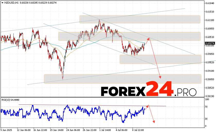 NZD/USD Forecast and Analysis for July 11, 2025 suggests an attempt to test the resistance area near the 0.6045 level. From there, we can expect the quotes to continue falling to an area below the 0.5885 level. An additional signal in favor of a decline will be a rebound from the resistance line on the relative strength indicator. A strong price increase and a breakout of the 0.6075 level will cancel the decline of the NZD/USD pair. In this case, we should expect the pair to continue rising with a potential target above the 0.6265 level.