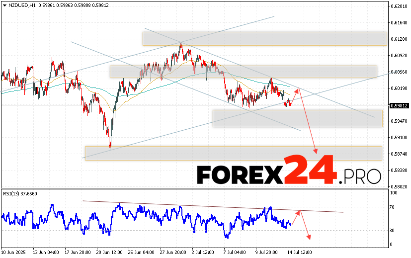NZD/USD Forecast and Analysis for July 15, 2025suggests an attempt to test the resistance area near the 0.6020 level. From there, we can expect the quotes to continue falling to an area below the 0.5875 level. An additional signal in favor of a decline will be a rebound from the resistance line on the relative strength indicator. A strong price increase and a breakout of the 0.6065 level will cancel the decline of the NZD/USD pair. In this case, we should expect the pair to continue rising with a potential target above the 0.6245 level.