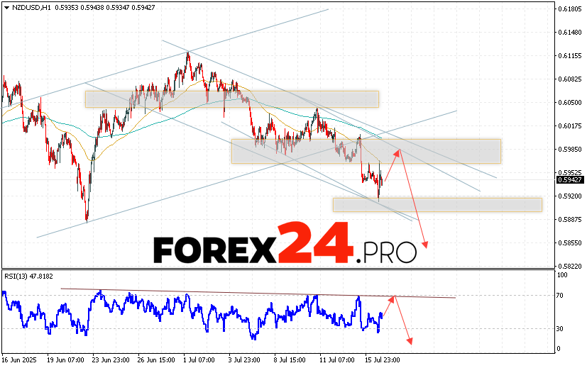 NZD/USD Forecast and Analysis for July 18, 2025 suggests an attempt to test the resistance area near the 0.5970 level. From there, we can expect the quotes to continue falling to an area below the 0.5845 level. An additional signal in favor of a decline will be a rebound from the resistance line on the relative strength indicator. A strong price increase and a breakout of the 0.6025 level will cancel the decline of the NZD/USD pair. In this case, we can expect the pair to continue rising with a potential target above the 0.6235 level.
