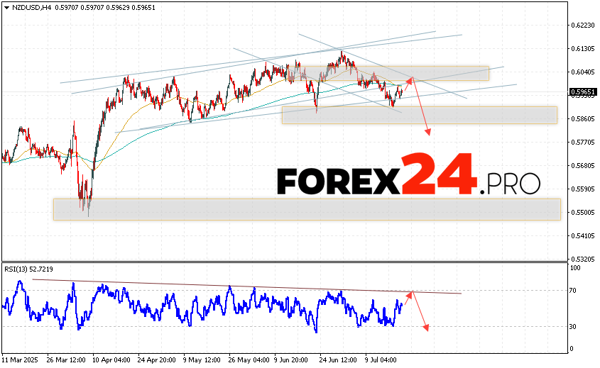 NZD/USD Forecast and Analysis for July 22, 2025 suggests an attempt to test the resistance area near the 0.5995 level. From there, we can expect the quotes to continue falling to an area below the 0.5785 level. An additional signal in favor of a decline will be a rebound from the resistance line on the relative strength indicator. A strong price increase and a breakout of the 0.6055 level will cancel the decline of the NZD/USD pair. In this case, we should expect the pair to continue rising with a potential target above the 0.6265 level.