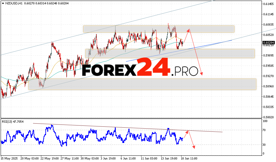 NZD/USD Forecast and Analysis for June 19, 2025 suggests an attempt to test the resistance area near the 0.6055 level. From there, we can expect the quotes to continue falling to an area below the 0.5925 level. An additional signal in favor of a decline will be a rebound from the resistance line on the relative strength indicator. A strong price increase and a breakout of the 0.6115 level will cancel the decline of the NZD/USD pair. In this case, we can expect the pair to continue rising with a potential target above the 0.6295 level.