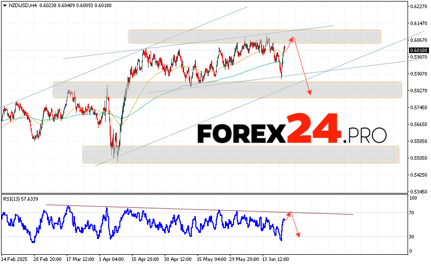 NZDUSD Forecast and Analysis for June 25, 2025suggests an attempt to test the resistance area near the 0.6065 level. From there, we can expect the quotes to continue falling to an area below the 0.5825 level. An additional signal in favor of a decline will be a rebound from the resistance line on the relative strength indicator. A strong price increase and a breakout of the 0.6135 level will cancel the decline of the NZD/USD pair. In this case, we can expect the pair to continue rising with a potential target above the 0.6385 level.