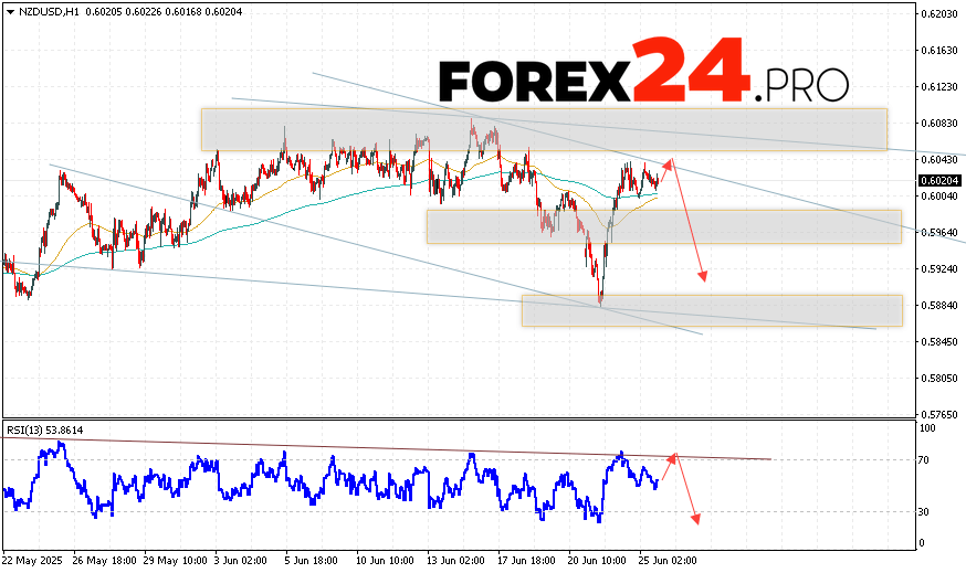 NZD/USD Forecast and Analysis for June 26, 2025suggests an attempt to test the resistance area near the 0.6045 level. From there, we can expect the quotes to continue falling to an area below the 0.5905 level. An additional signal in favor of a decline will be a rebound from the resistance line on the relative strength indicator. A strong price increase and a breakout of the 0.6125 level will cancel the decline of the NZD/USD pair. In this case, we should expect the pair to continue rising with a potential target above the 0.6365 level.