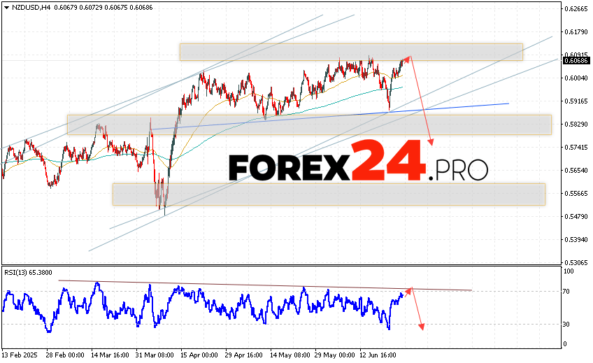 NZD/USD Forecast and Analysis for June 27, 2025 suggests an attempt to test the resistance area near the 0.6085 level. From there, we can expect quotes to continue falling to an area below the 0.5745 level. An additional signal in favor of a decline will be a rebound from the resistance line on the relative strength indicator. A strong price increase and a breakout of the 0.6145 level will cancel the decline of the NZD/USD pair. In this case, we should expect the pair to continue rising with a potential target above the 0.6385 level.