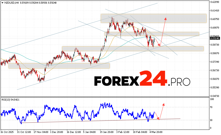 NZD/USD Forecast and Analysis for March 10, 2026 suggests an attempt to test the support area near 0.5870. From there, we should expect continued price growth above 0.6075. A rebound from the support line on the relative strength indicator (RSI) would be an additional signal of growth. The NZD/USD pair’s upward trend would be cancelled by a price decline and a breakout of 0.5775. In this case, we should expect continued decline, with a potential target below 0.5585.