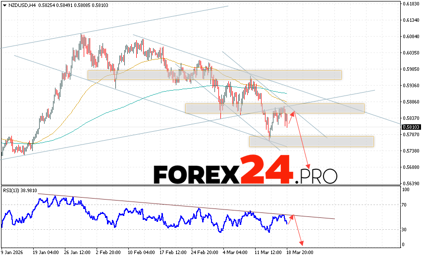 NZD/USD Forecast and Analysis for March 19, 2026 suggests an attempt to test the resistance area near 0.5840. From here, we should expect a continued decline in quotes below 0.5685. A rebound from the resistance line on the relative strength indicator (RSI) would be an additional signal of a decline. A strong price increase and a breakout of 0.5905 would cancel out the NZD/USD pair’s downward trend. In this case, we should expect the pair to continue rising, with a potential target above 0.6175.