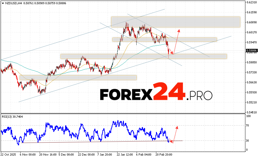 NZD/USD Forecast and Analysis for March 4, 2026 suggests an attempt to test the support area near 0.5835. From there, we should expect continued price growth above 0.6035. A rebound from the support line on the relative strength indicator (RSI) would be an additional signal in favor of an uptrend. A price decline and a breakout of 0.5795 would cancel out the NZD/USD’s upward trend. In this case, we should expect continued decline, with a potential target below 0.5635.