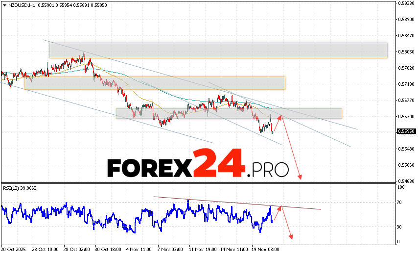 NZD/USD Forecast and Analysis for November 21, 2025 suggests an attempt to test the resistance area near 0.5635. From there, we should expect a continued decline below 0.5465. A rebound from the resistance line on the relative strength indicator (RSI) would be an additional signal of decline. A strong price increase and a breakout of 0.5705 would cancel out the NZD/USD downside scenario. In this case, we should expect continued growth with a potential target above 0.5885.